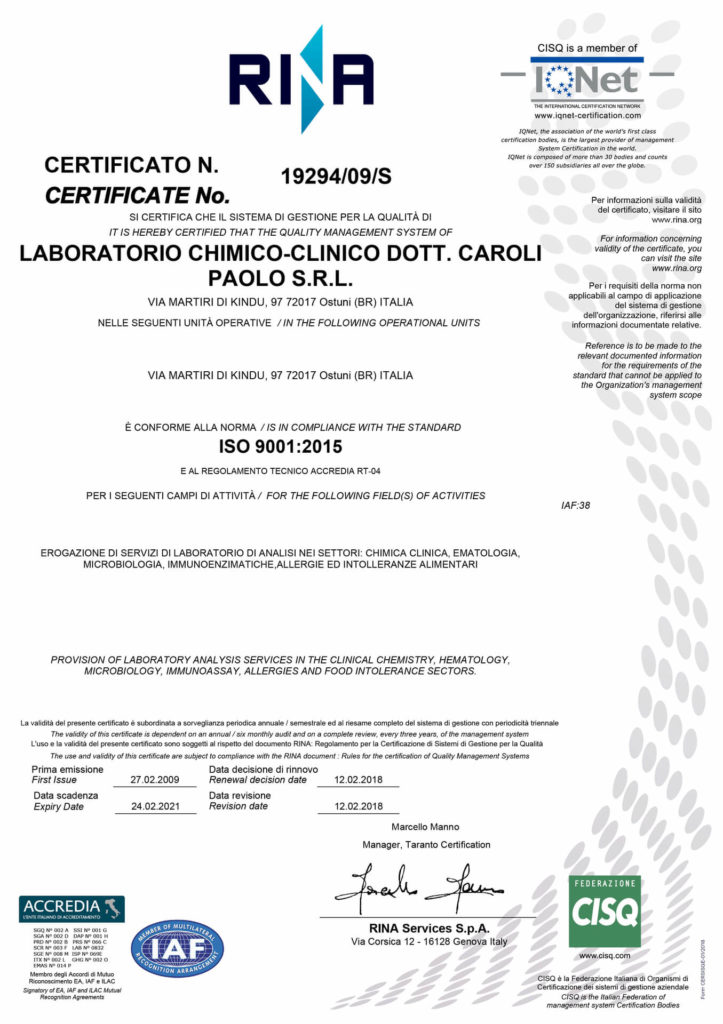 Il laboratorio d’analisi Dr. Paolo Caroli srl ha ottenuto la certificazione del suo sistema di qualità nel 2009 secondo la norma ISO 9001:2008 da parte dell’Organismo di Certificazione RINA Service spa…